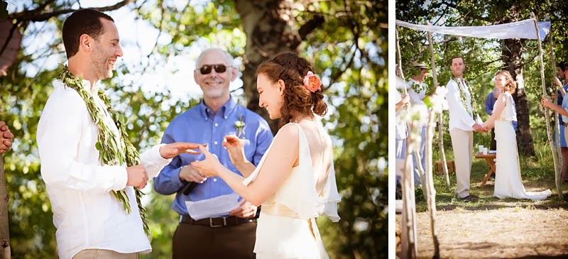 Our wedding was a very homegrown event, and came together with the help and love of many, many family members and friends: Eli's father officiated, my brother made our cake, our friends mowed paths, made outdoor showers and camping areas; my father found and cut down the aspen trees that became the poles of our chuppah, and our amazing friend Sarah acted as our "Day-Of" guru, making sure everything ran smoothly; Eli's mom cooked for the work party in the days preceding our wedding, and my mom, brother and brother's girlfriend cooked a brunch for the day after our wedding; my friend Chelsea Jepson of CRJ Jewels made my jewelery, and our friend Kim Williamson of Dottyspeck made Eli's ring; our friend Caleb wrote and played the music for our ceremony; my friend Talia did my hair and make-up; my amazing sister-in-law Olivia, and friends Nikki and Chelsea spent the days before our wedding with me making all the flower arrangements, and three of my cousins made all the boutonnieres and corsages; our friend Daven created signature cocktails for us, and Eli's brother Ben was the rock that held it all together. It was all done with a spirit of love and community, and my absolute favorite thing about our wedding was the way that it brought all of our loved ones together.